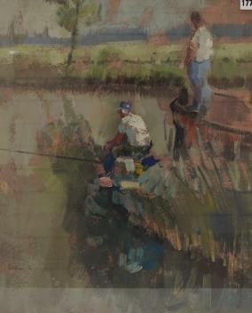 Lot 1774 , 20th century school, anglers fishing on a lake, Impressionist oil on board, 53 x 43cm