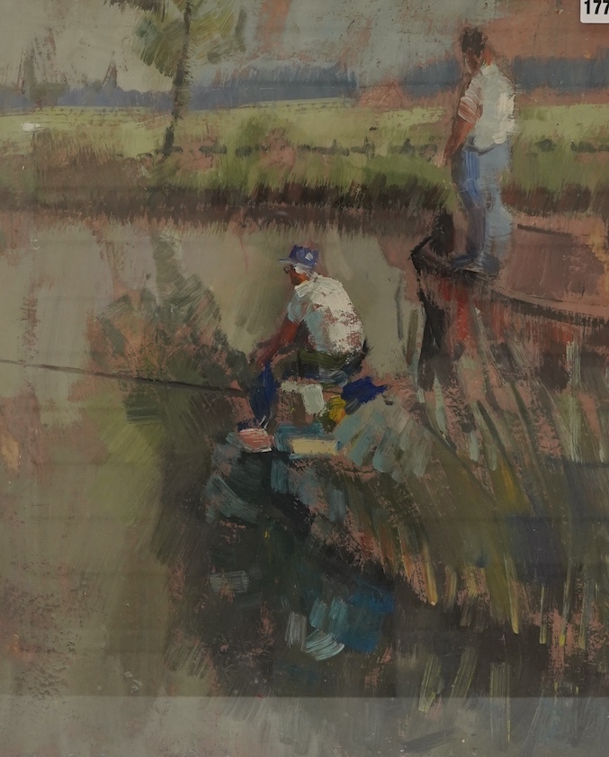 20th century school, anglers fishing on a lake, Impressionist oil on board, 53 x 43cm