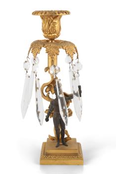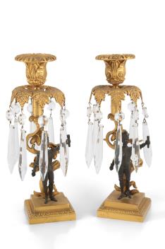 Lot 48 , A pair of brown patinated and ormolu lustre candlesticks