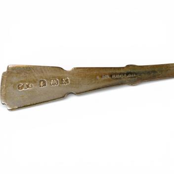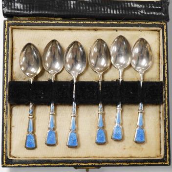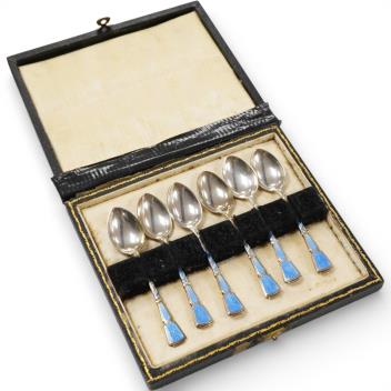 Lot 857 , A cased set of six George VI silver and enamel coffee spoons, Turner & Simpson, Birmingham, 1947, 94mm.