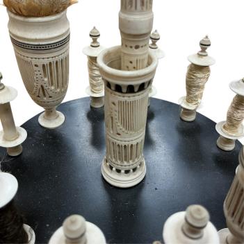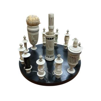 Lot 1392 , A 19th century bone sewing stand, wood base probably associated, diameter 15cm.