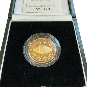 British gold coins, Elizabeth II, Royal Mint Rugby World Cup gold proof £2 coin, 1999, in case of issue with certificate
