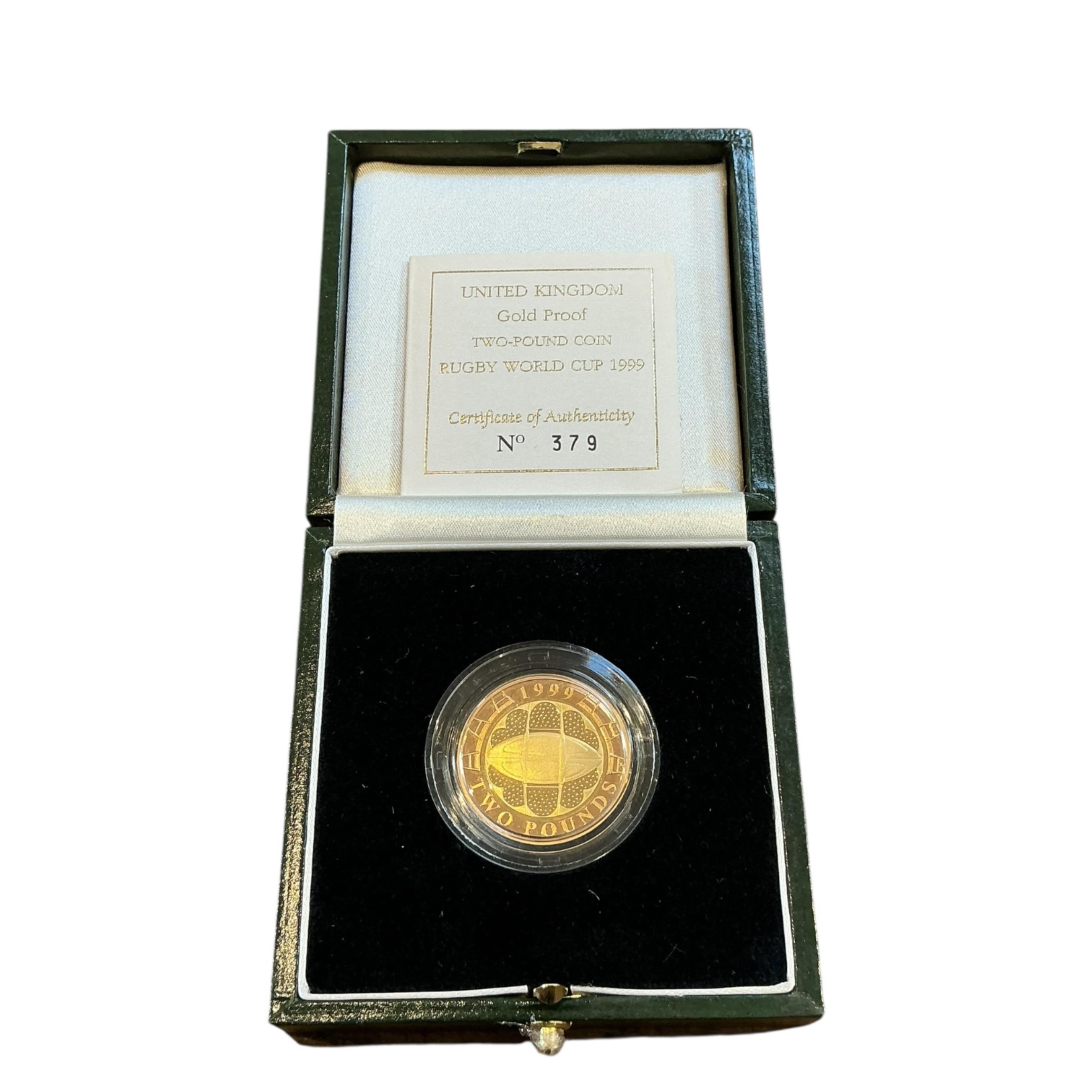 Lot 2129 , British gold coins, Elizabeth II, Royal Mint Rugby World Cup gold proof £2 coin, 1999, in case of issue with certificate