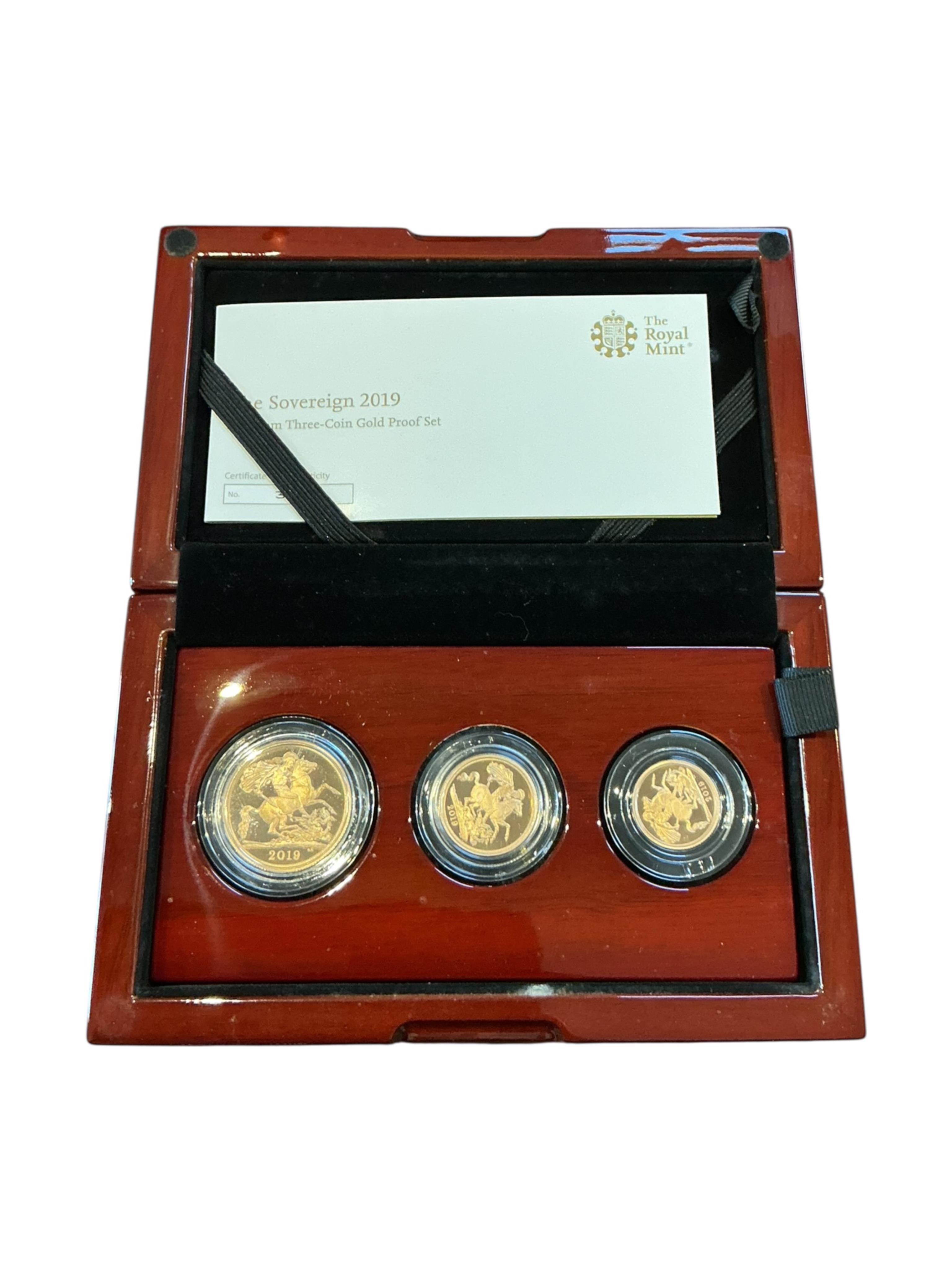 Lot 2115 , British gold coins, Elizabeth II, Royal Mint gold proof three coin set, 2019, comprising £2, sovereign and half sovereign, in case of issue with certificate