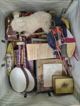 Lot 1346 , An early 20th century trunk containing toys and games including ‘Fishponds, parlour game’ and a miniature pull along dog