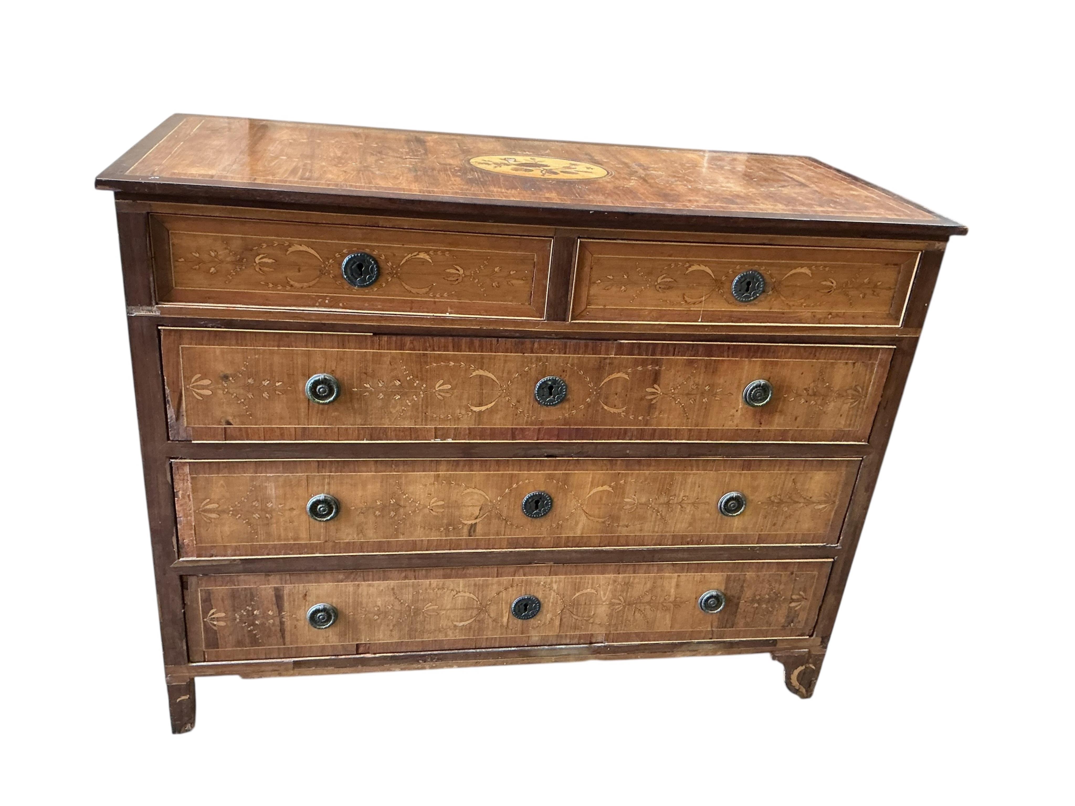 An 18th century Milanese marquetry inlaid commode, width 128cm, depth 57cm, height 99cm