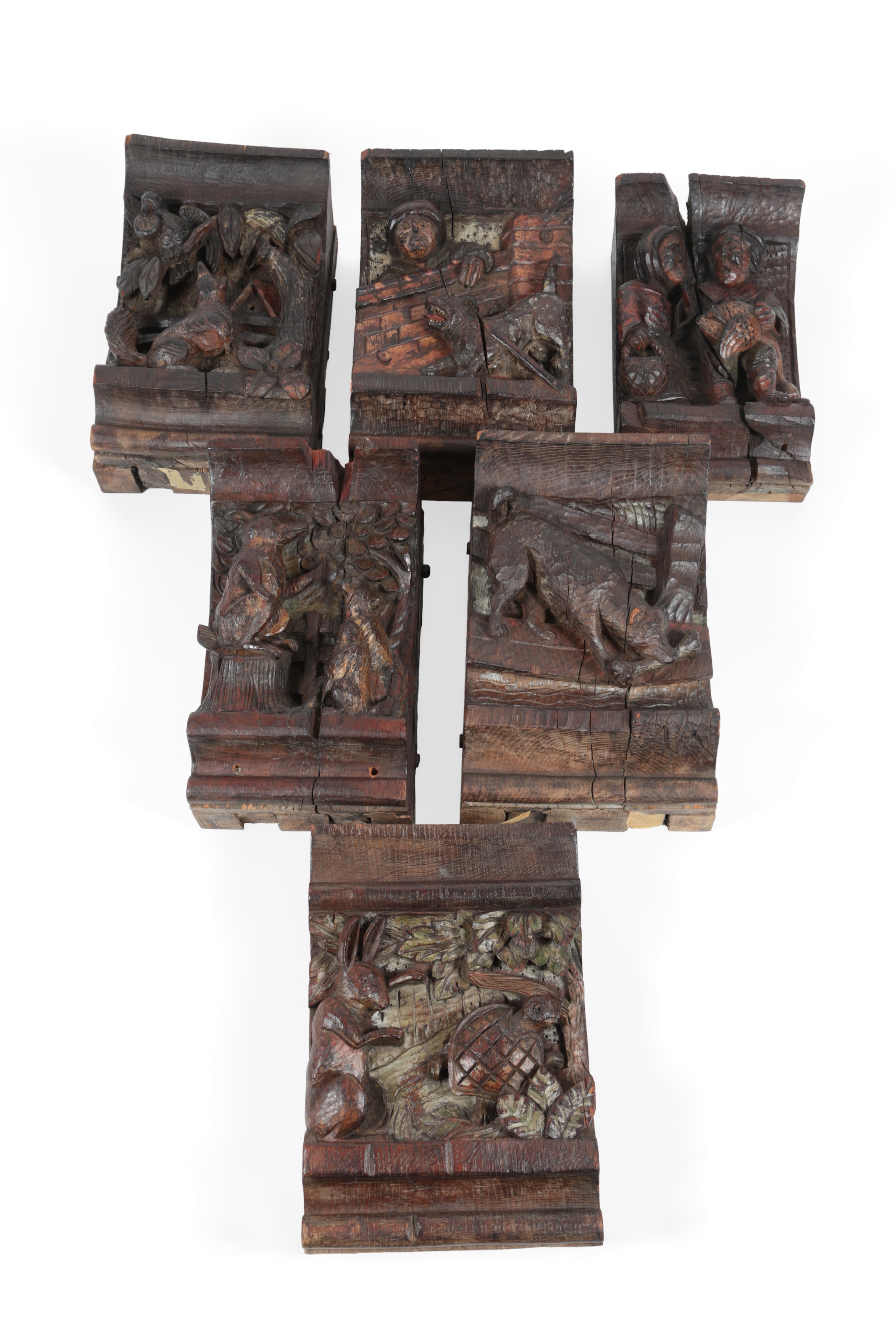 A set of six Northern European carved oak figural carvings of Aesops Fables