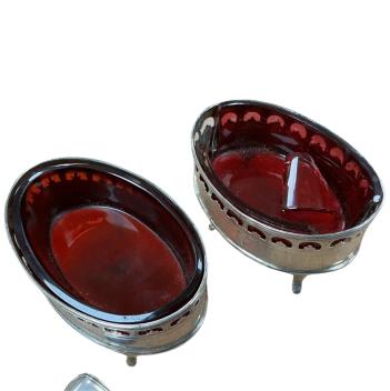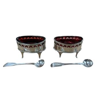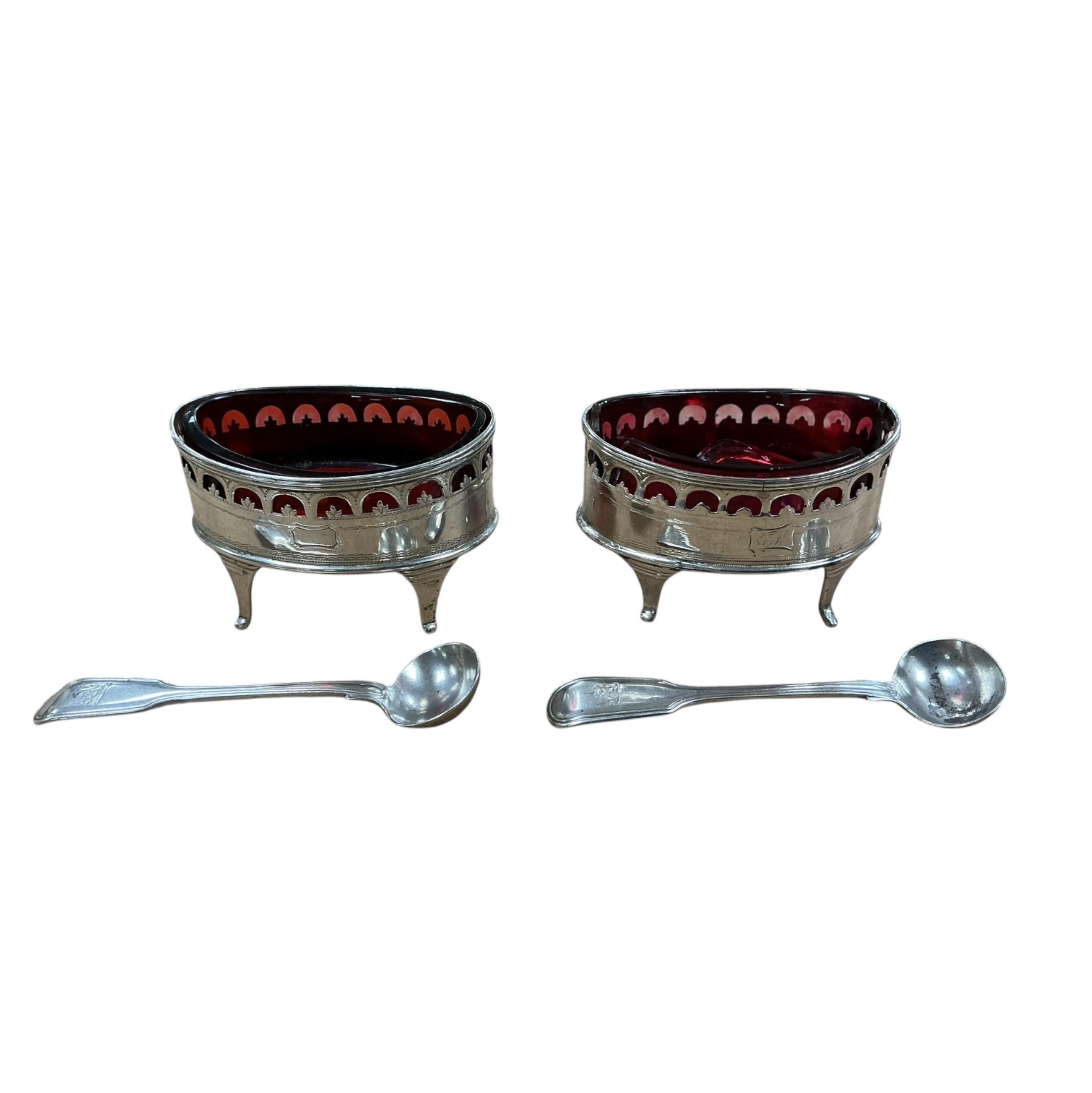 Lot 1852 , A matched pair of 19th century silver oval salts with ruby glass liners(one a.f.) and a pair of Victorian silver fiddle and thread pattern mustard ladles by Elizabeth Eaton, London, 1850.