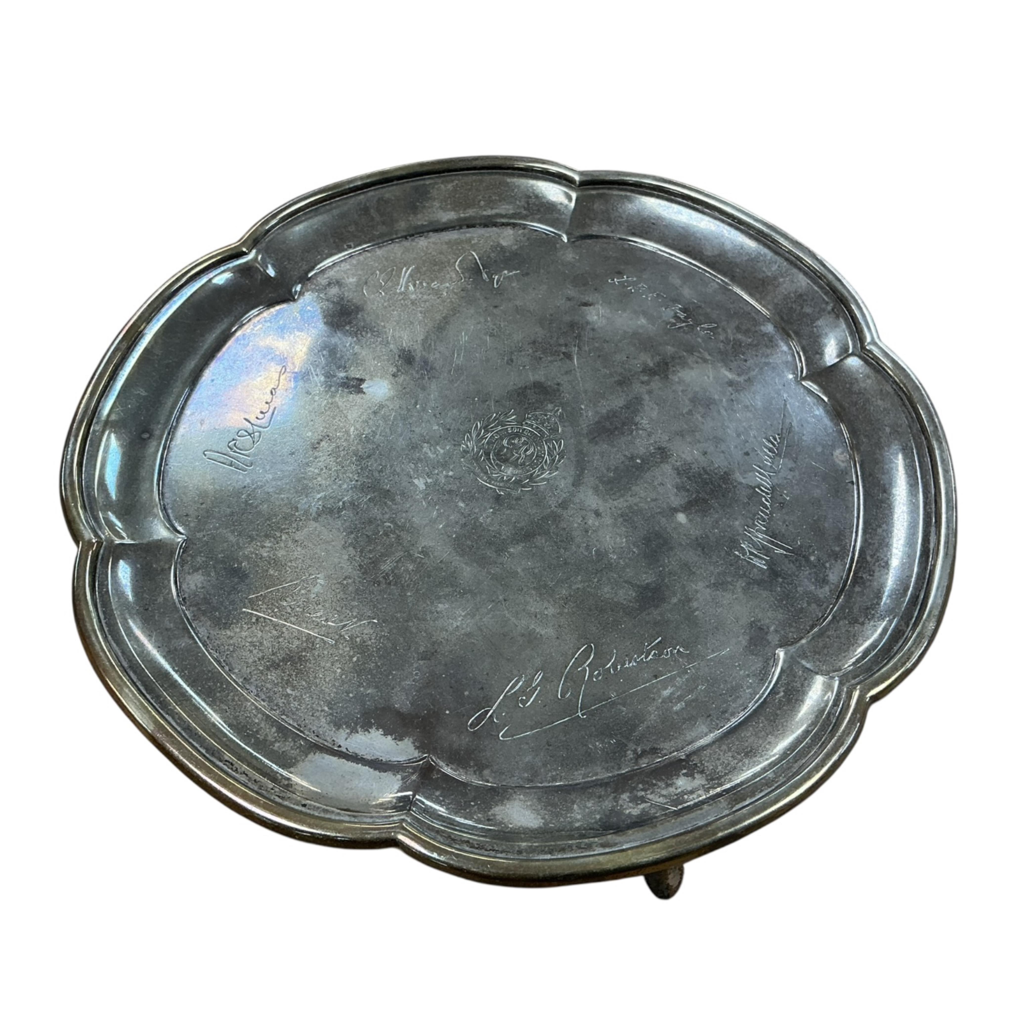 Lot 1859 , A George V silver salver, by Atkin Brothers, Sheffield, 1930, engraved with the Royal Engineers crest and assorted signatures, diameter 20.2cm, 10oz.