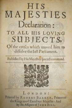Lot 1070 , Charles I (King) His Majesties Declaration: to all his loving subjects, of the causes which moved him to dissolve the last Parliament ... engraved title decoration with royal arms on verso, headpiece decoration and comme
