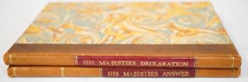 ° Charles I (King) His Majesties Declaration: to all his loving subjects, of the causes which moved him to dissolve the last Parliament ... engraved title decoration with royal arms on verso, headpiece decoration and commencing initial letter; (2), 1-7, (8-12 irregular) and 13-55pp.; newly rebound calf backed marbled boards with red label, sm.4to. Printed by Robert Barker ... and by the Assignes of John Bill, 1640. *the dissolution of the 'Short' Parliament; Charles I (King) His Majesties Answer to the XIX. Propositions of both Houses of Parliament. title decoration and within decorated engraved border, royal arms on verso, headpiece decoration and commencing initial letter; (2) 30pp.; black letter; binding uniform with first item. Printed by Robert Barker ... and by the Assignes of John Bill, 1642. * Parliament's June 1642 demands were for political and military control, church reform etc.; the King's rejection of them signalled the onset of the Civil War.