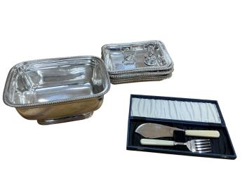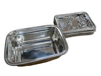 Lot 480 , Three silver plated dishes with covers and handles and a large two handled vegetable dish and a cased pair of plated fish servers