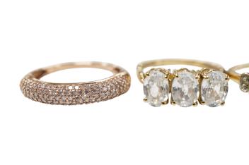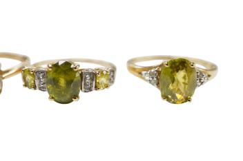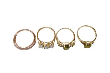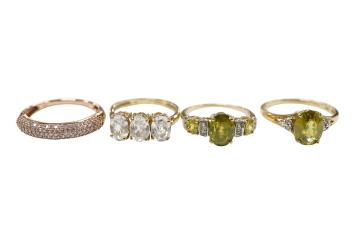 Lot 1901 , Four assorted modern 9ct gold and gem set rings including three stone white zircon, size N, three stone peridot and four stone diamond chip, size N/O and pink diamond chip cluster, size Q.