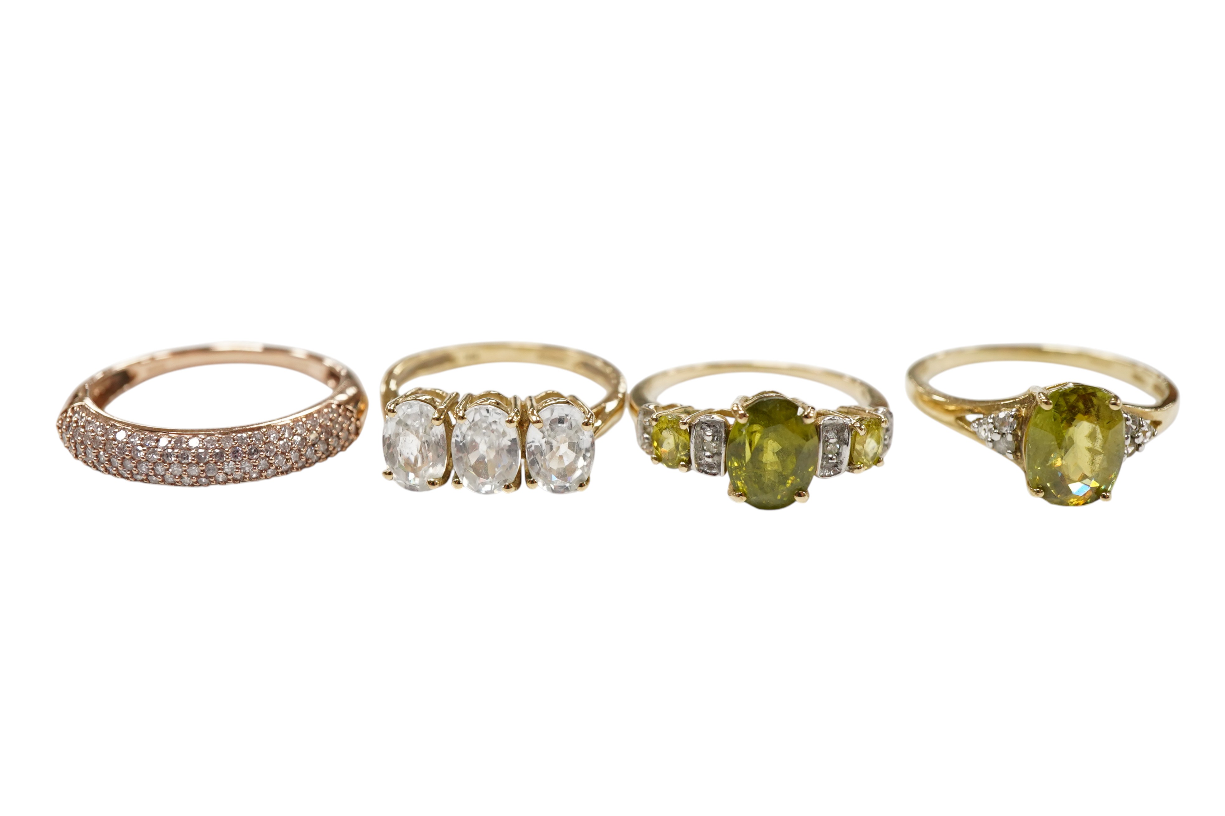 Four assorted modern 9ct gold and gem set rings including three stone white zircon, size N, three stone peridot and four stone diamond chip, size N/O and pink diamond chip cluster, size Q.