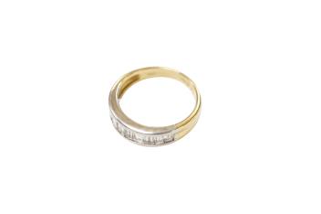 Lot 1921 , A recent yellow metal, stamped 750 and ten stone graduated baguette cut diamond set half hoop ring, size M.