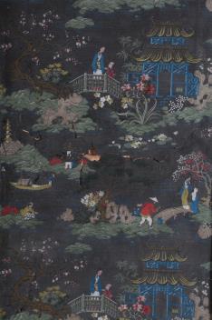the frames inset with stencilled designs on paper of Chinese figures in river landscapes, 171cm wide fully extended, 167cm high