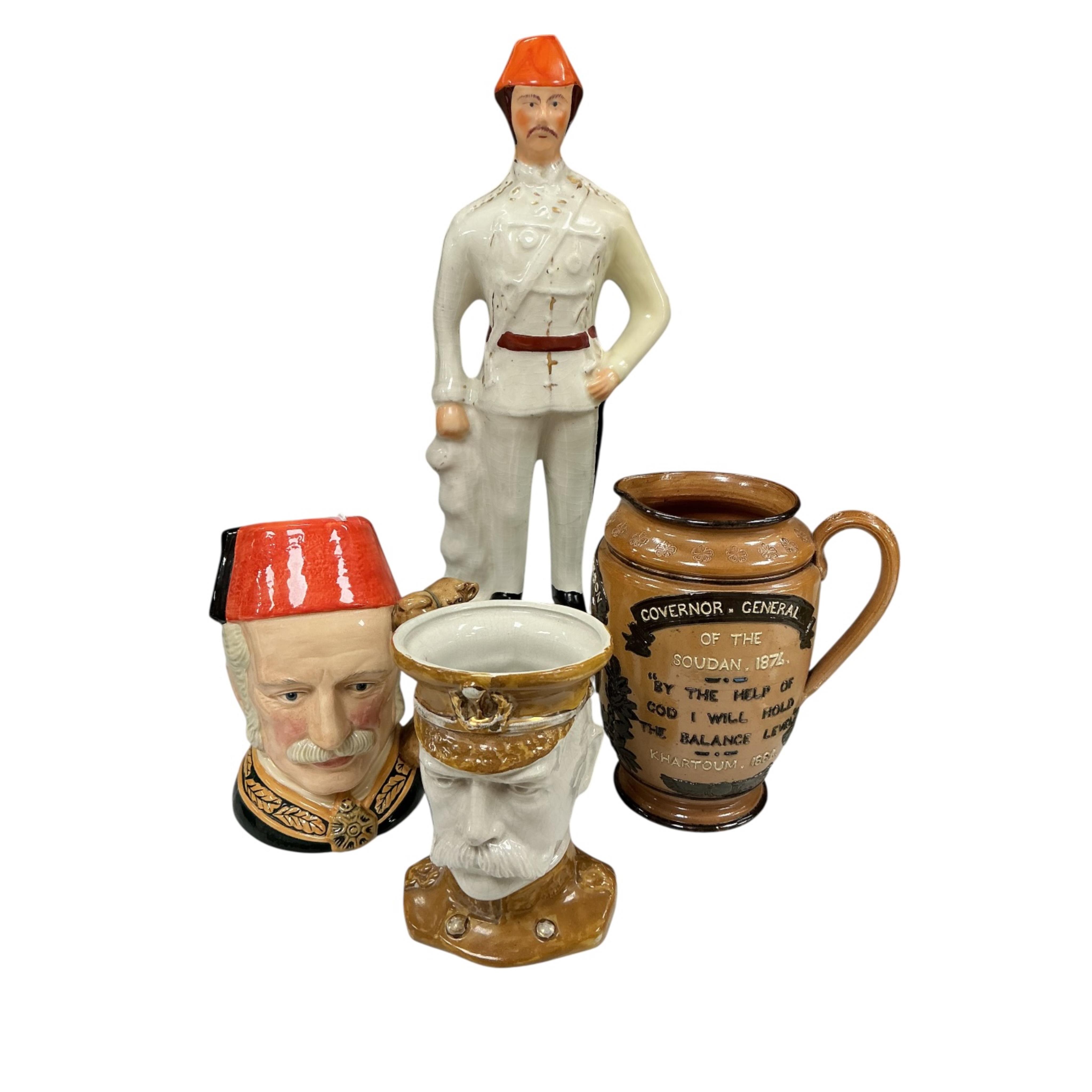 Lot 1450 , A Victorian Doulton Lambeth General Gordon commemorative jug, 19cm high, a Victorian Staffordshire figure of Gordon, a later character jug and a Kitchener character jug.