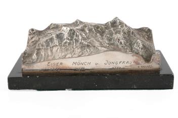 Xaver Imfeld (Swiss, 1853-1909) for WMF: 'Eiger, Mönch u Jungfrau' a topographic scale model of Alpine mountains, produced by the Scholl Brothers, Zurich, silver plate, 13.5cm wide, raised on a rectangular black marble base, 16cm wide overall; together with another similar model 'Fünffinger-Spitze', by L. Hegerter Jng., 12cm wide overall (2)