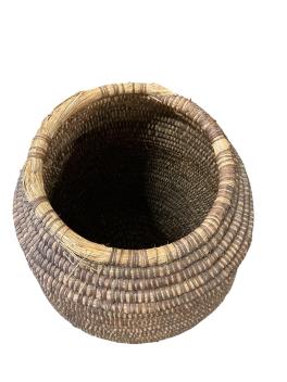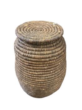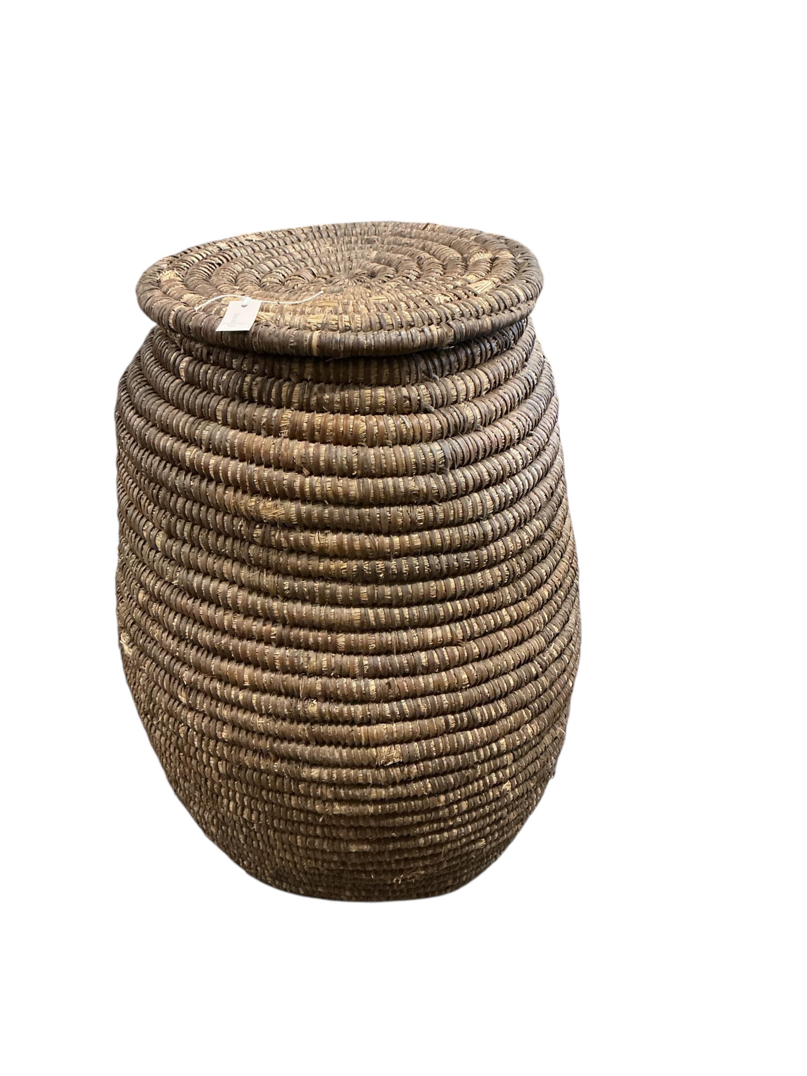 A large French bramble bark bound straw basket grain store, diameter 60cm, height 95cm