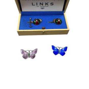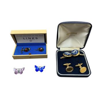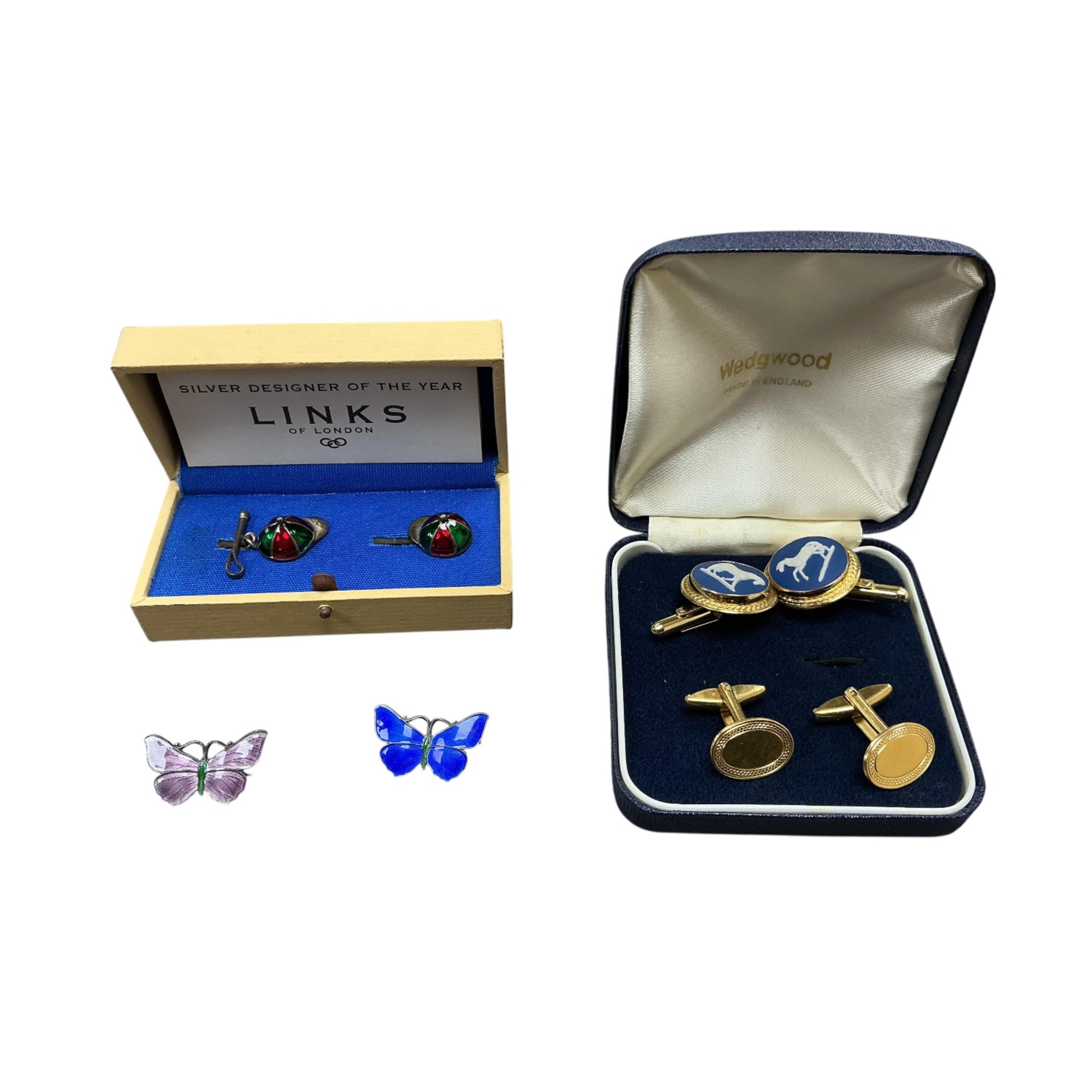 A collection of three pairs of cufflinks, including a pair modelled as jockey's helmets and riding crops in enamel, a pair of jasperware ceramic cufflinks by Wedgwood and another pair in gilt metal; together with two enamel butterfly brooches, length 2.7cm each, stamped Sterling