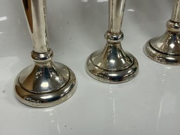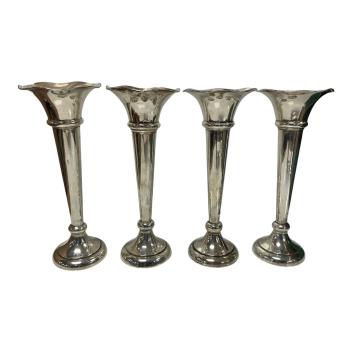 Lot 1829 , A set of four George V silver mounted spill vases, Williams Ltd, Birmingham, 1910, 21.5cm, weighted.