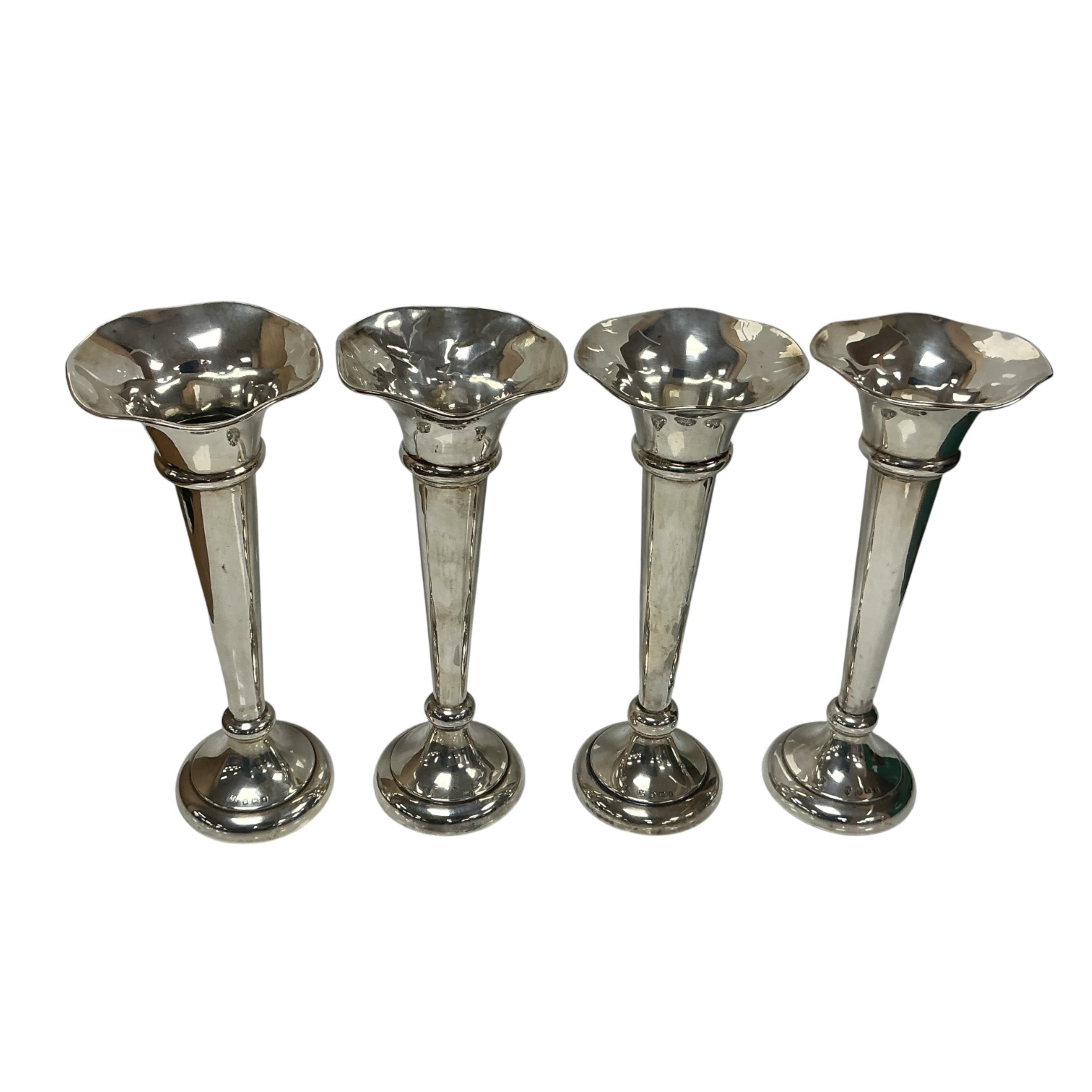 A set of four George V silver mounted spill vases, Williams Ltd, Birmingham, 1910, 21.5cm, weighted.