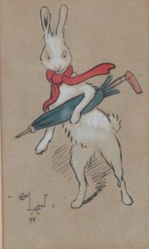 Lot 8 , Cecil Aldin, (1870-1935), Study of a white rabbit wearing a red scarf and holding an umbrella