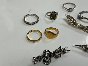 Lot 1924 , A 1930's 22ct gold wedding band, size P, 4 grams, an unmarked yellow metal signet ring, 6 grams, a 9ct and paste set brooch and nine other items of jewellery including costume and white metal stamped 'sterling silver'