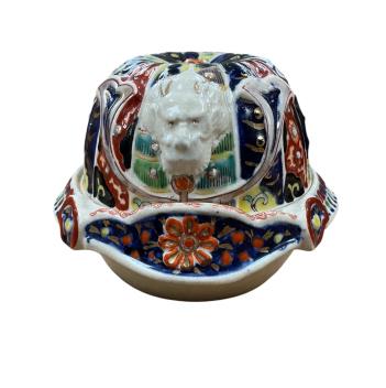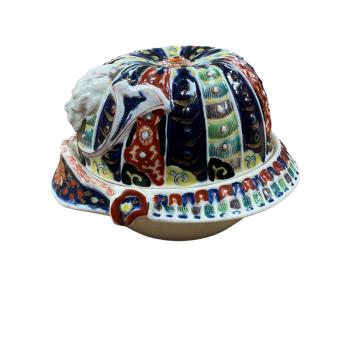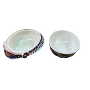 Lot 1459 , An Imari pottery dish and cover modelled as a Samurai helmet and a small lacquered rectangular box, largest 14cm wide