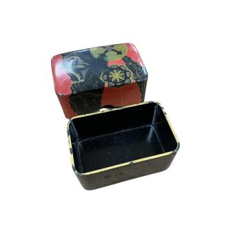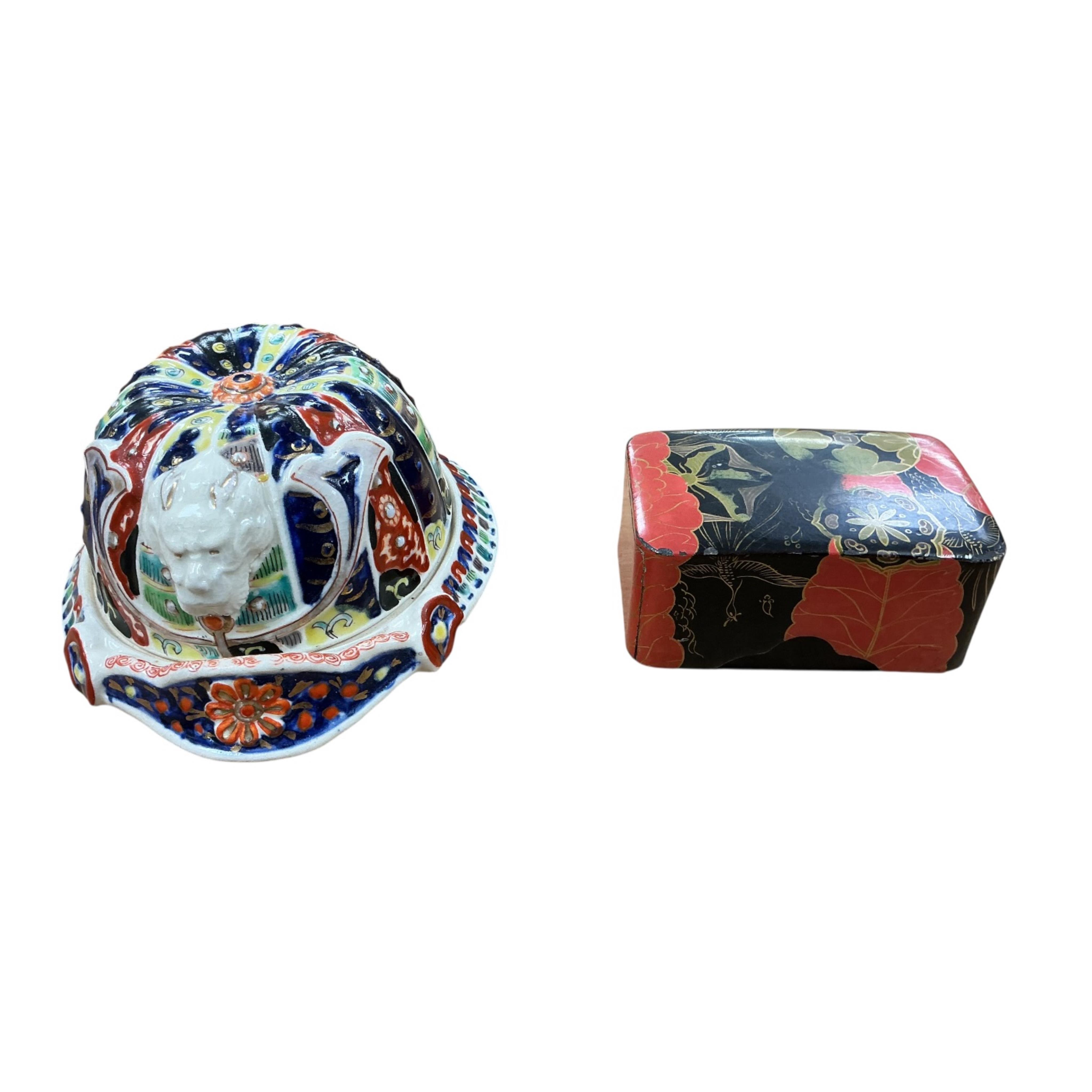 An Imari pottery dish and cover modelled as a Samurai helmet and a small lacquered rectangular box, largest 14cm wide