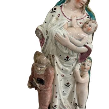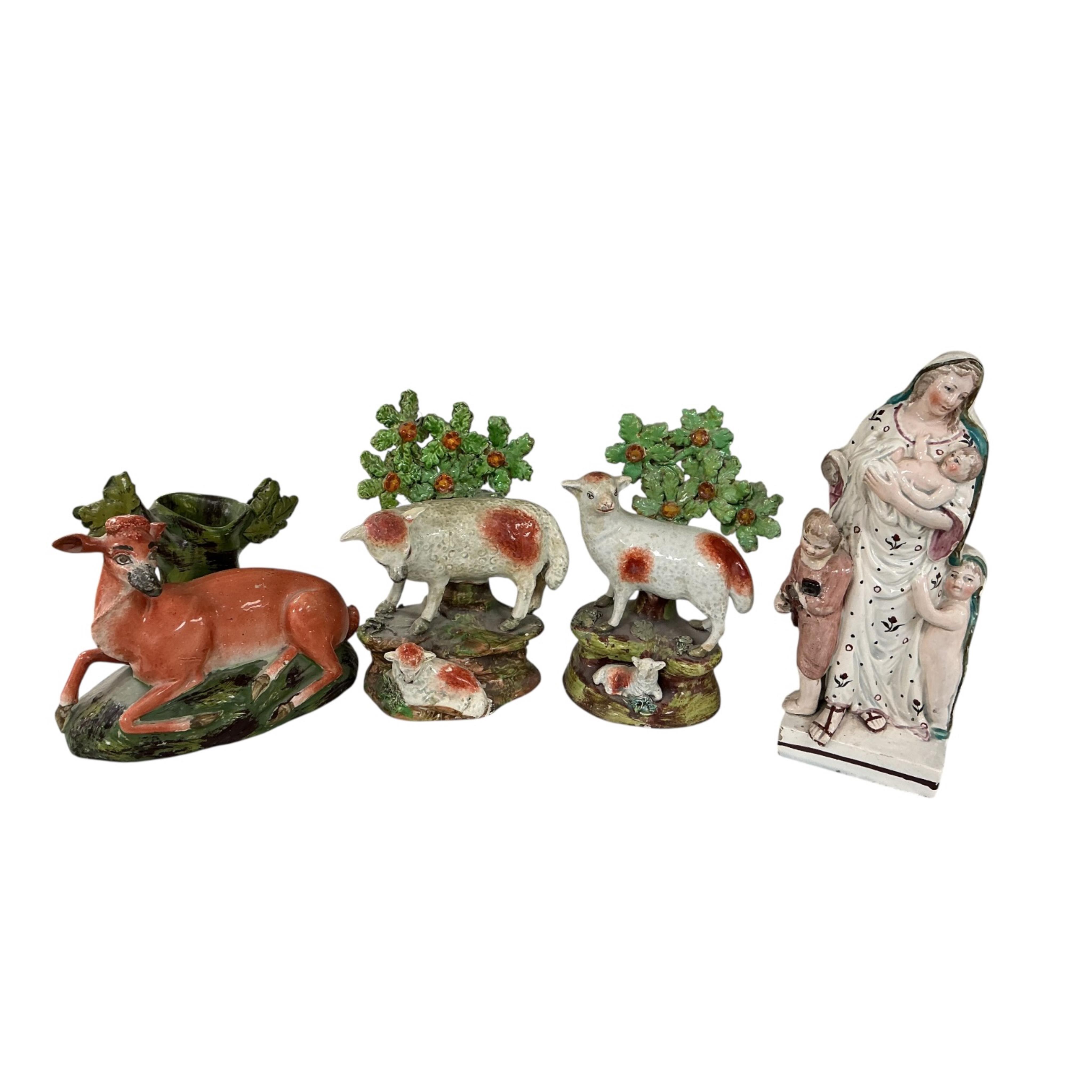 Lot 1432 , An early 19th century Staffordshire pearlware figure “Charity”, a pair of bocage groups and a deer spill vase, largest 18cm high. (4)