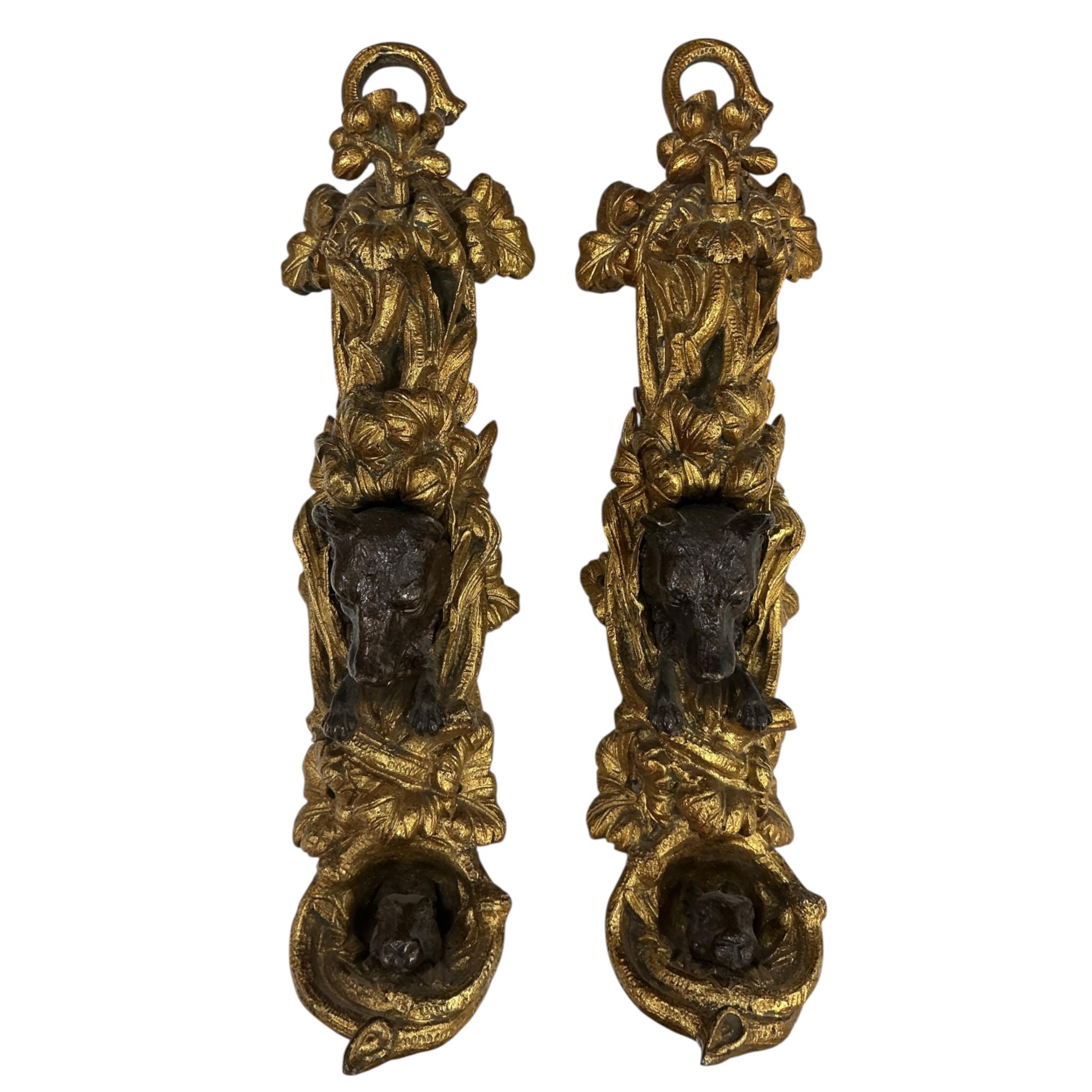 A pair of ormolu and bronze wolf and hare appliqués, 25cm high.