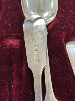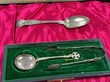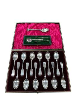 Lot 1861 , A cased set of twelve Edwardian silver fiddle pattern teaspoons, by John Round, Sheffield, 1901, two other silver spoons and a pair of silver sugar tongs. etc.
