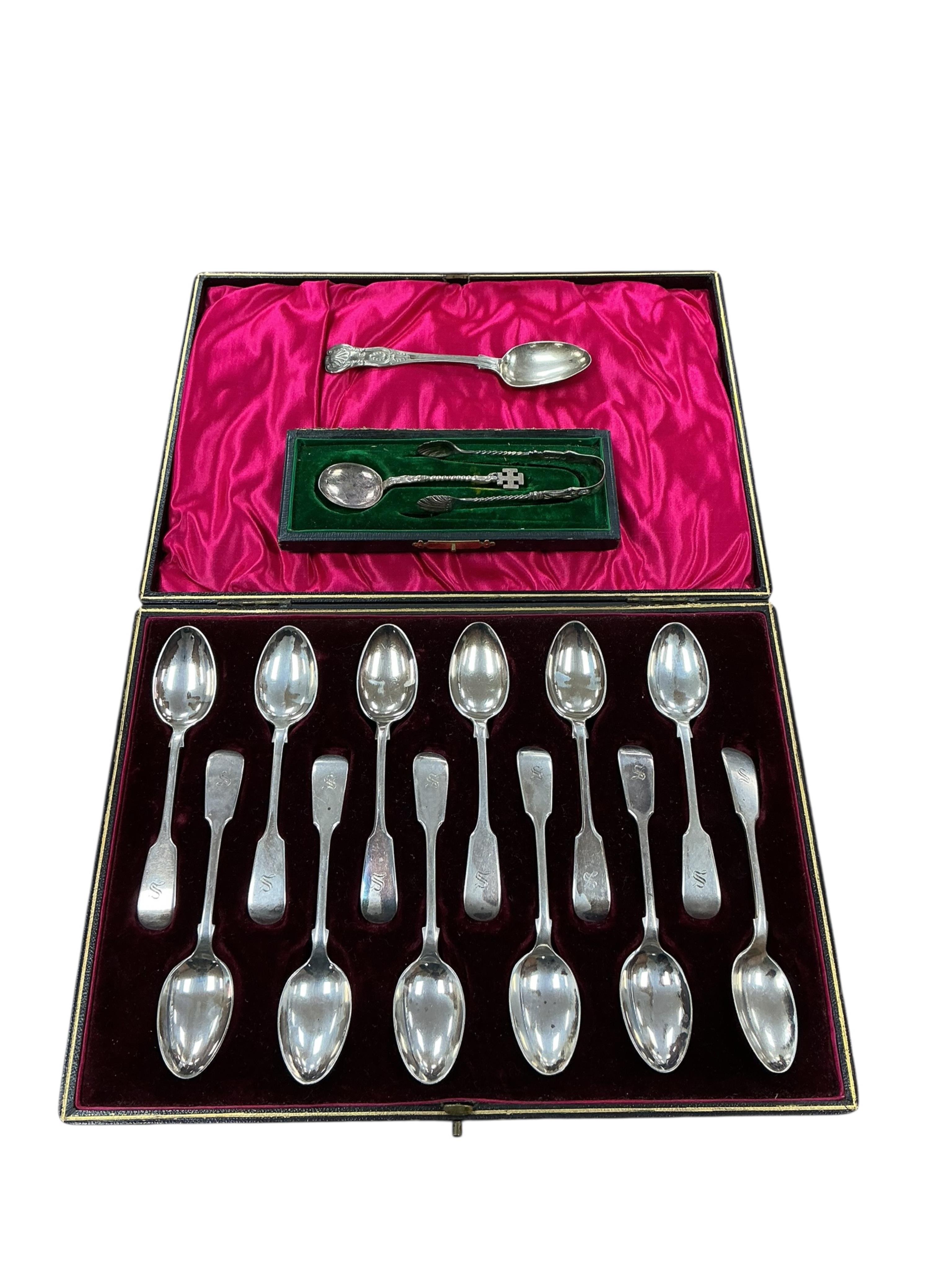 A cased set of twelve Edwardian silver fiddle pattern teaspoons, by John Round, Sheffield, 1901, two other silver spoons and a pair of silver sugar tongs. etc.