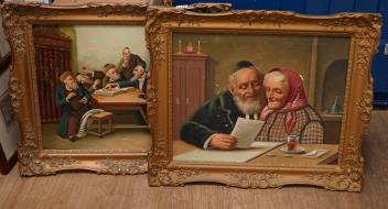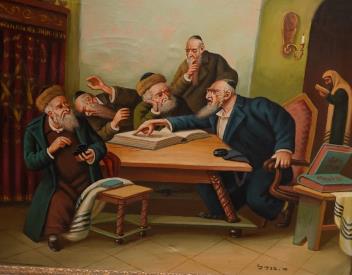 Lot 1775 , 20th century, Jewish school, ‘A Couple Reading the Torah’ and ‘Talmudic debate’, each signed, two oils on canvas, 39 x 49cm