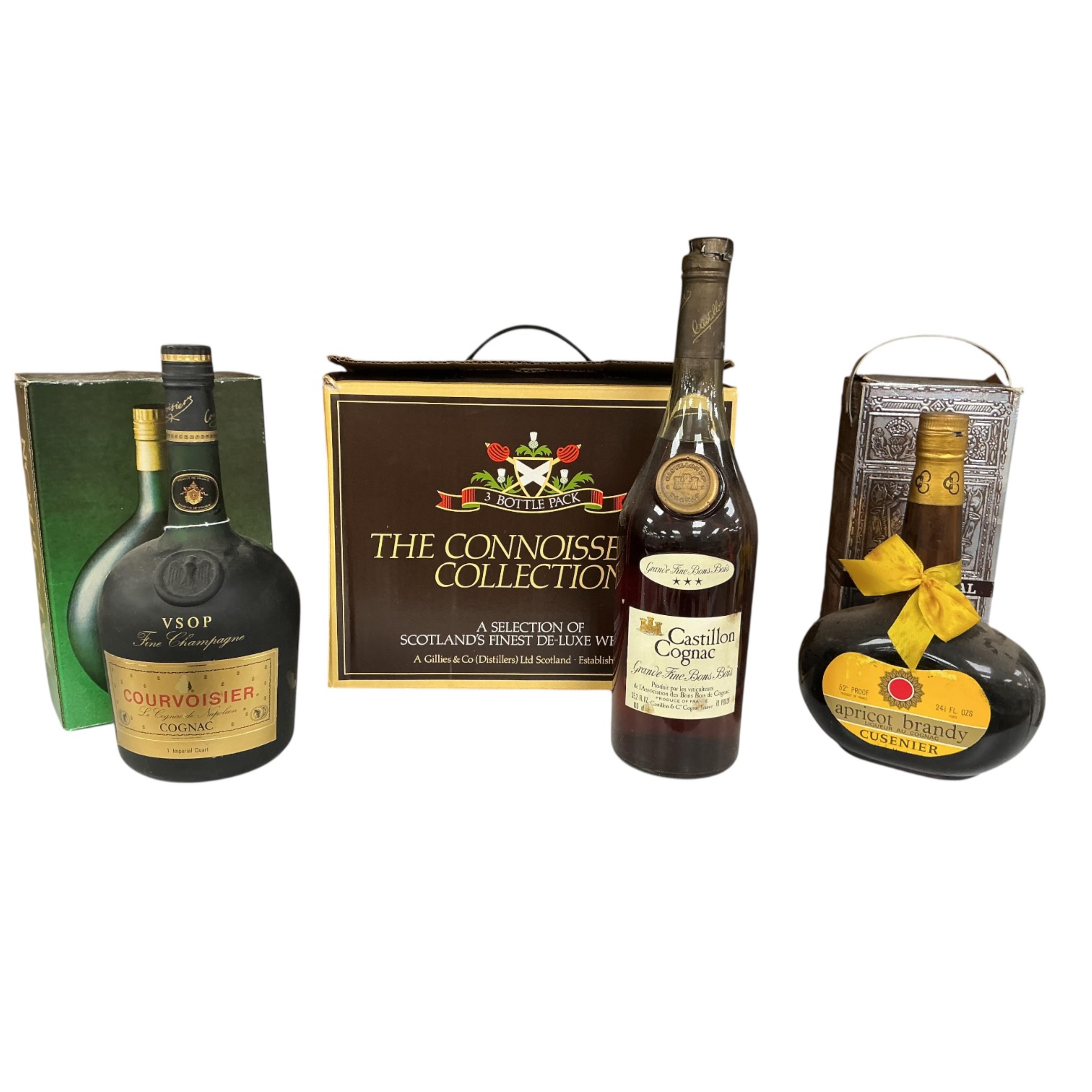 Lot 1482 , Four bottles of assorted cognacs, a Gillies three-bottle pack of connoisseur’s Whiskies and a bottle of Chivas Regal whisky