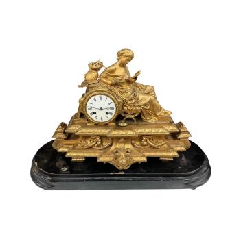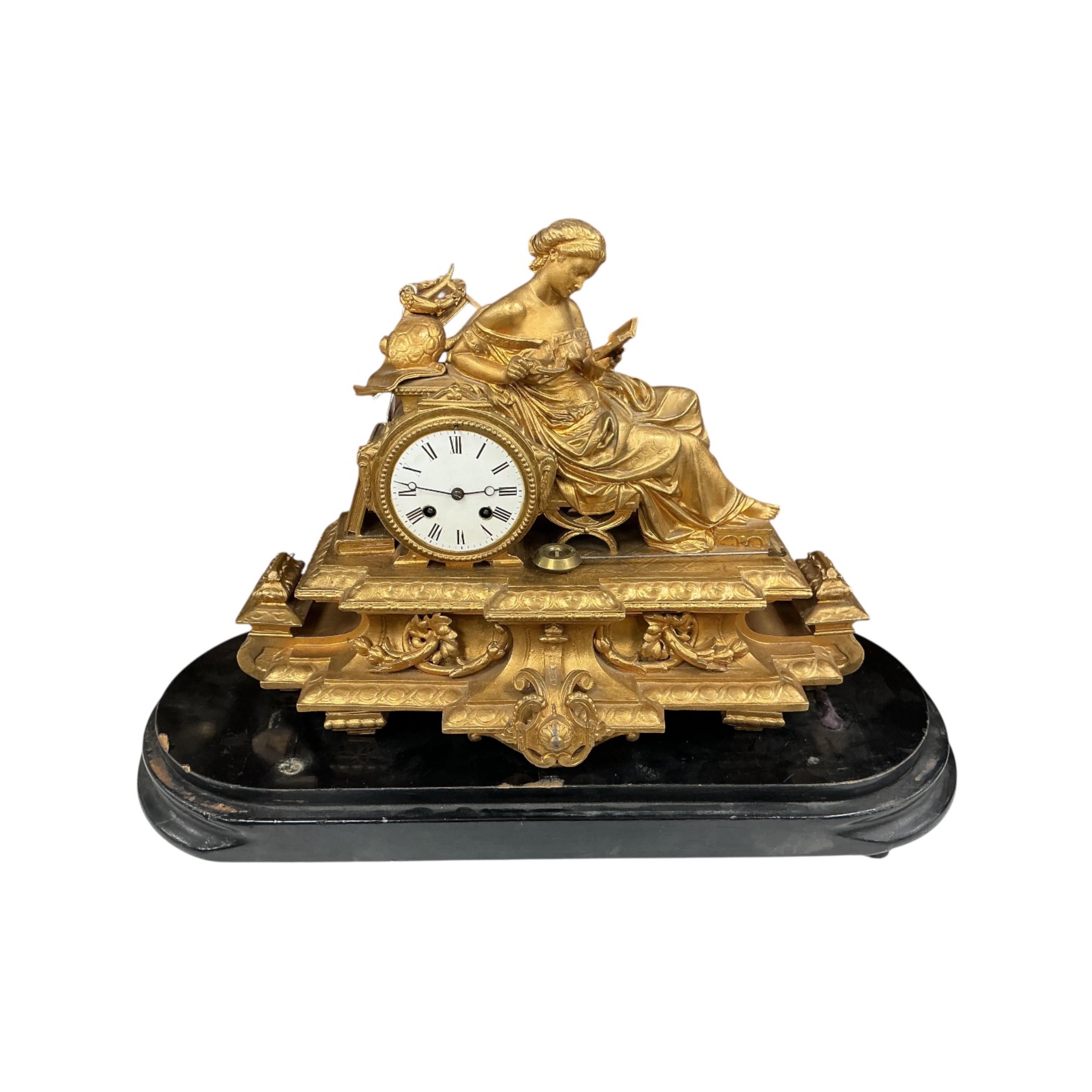 Lot 1498 , A late 19th century gilt spelter mantel clock surmounted with a lady reading a book, raised on ebonised base, with pendulum, 40cm high