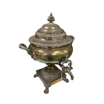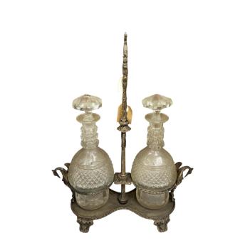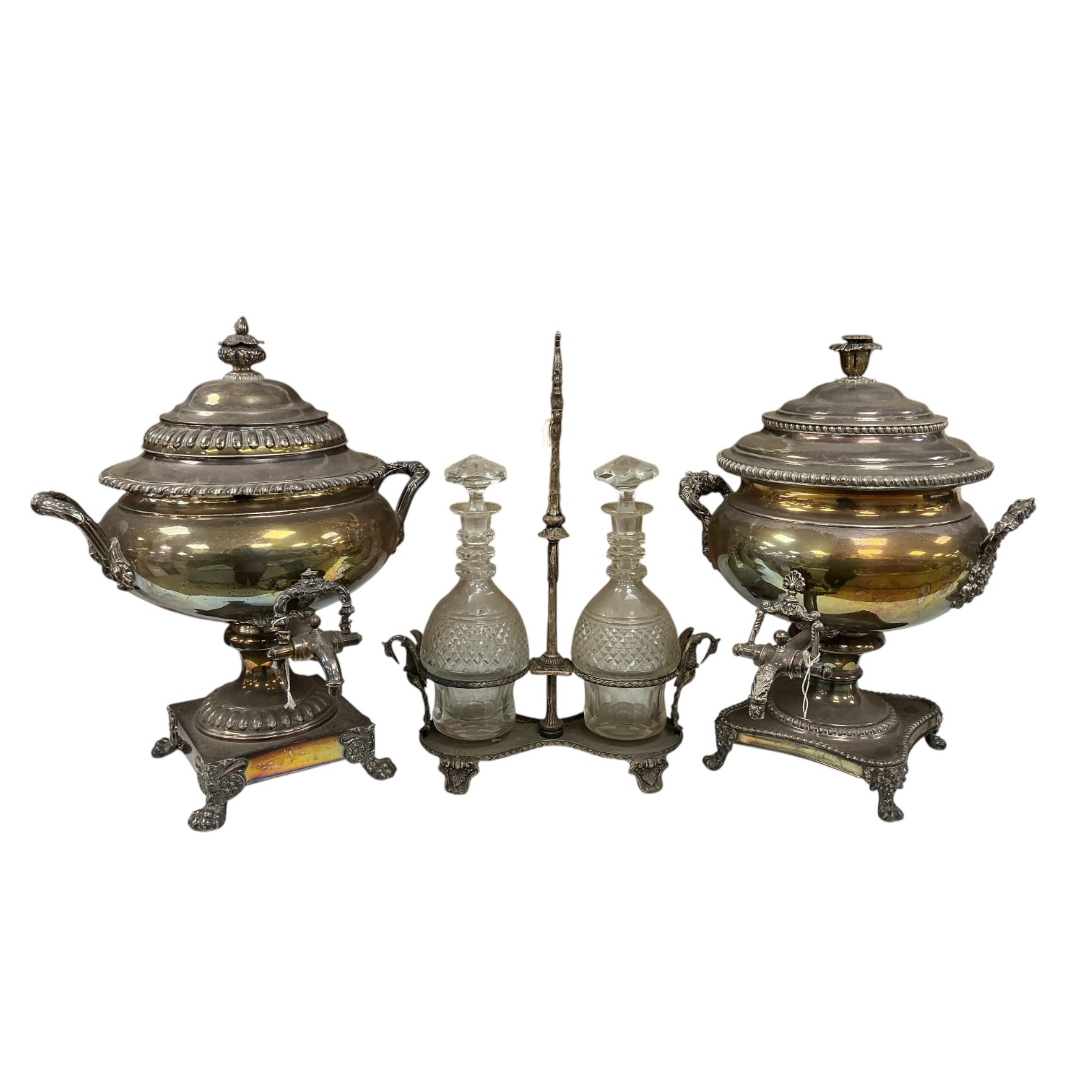 Lot 1500 , A pair of Victorian silver plated urns and a two bottle decanter stand with a pair of cut glass decanters, largest each 44cm high
