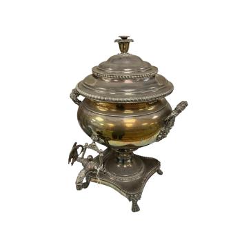 A pair of Victorian silver plated urns and a two bottle decanter stand with a pair of cut glass decanters, largest each 44cm high