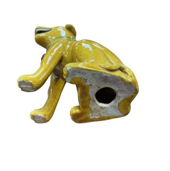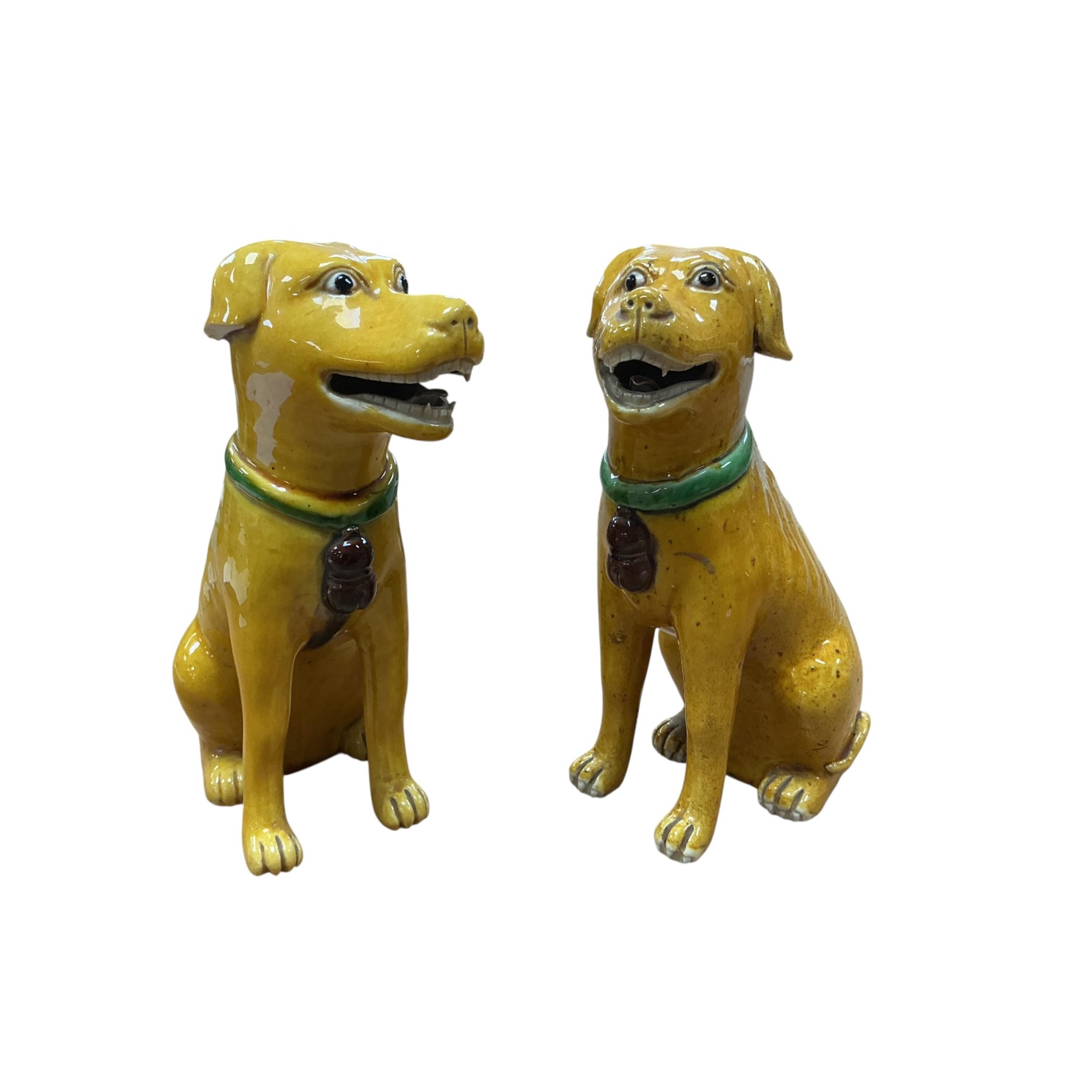 A pair of Chinese yellow glazed seated dog figures, 17cm high