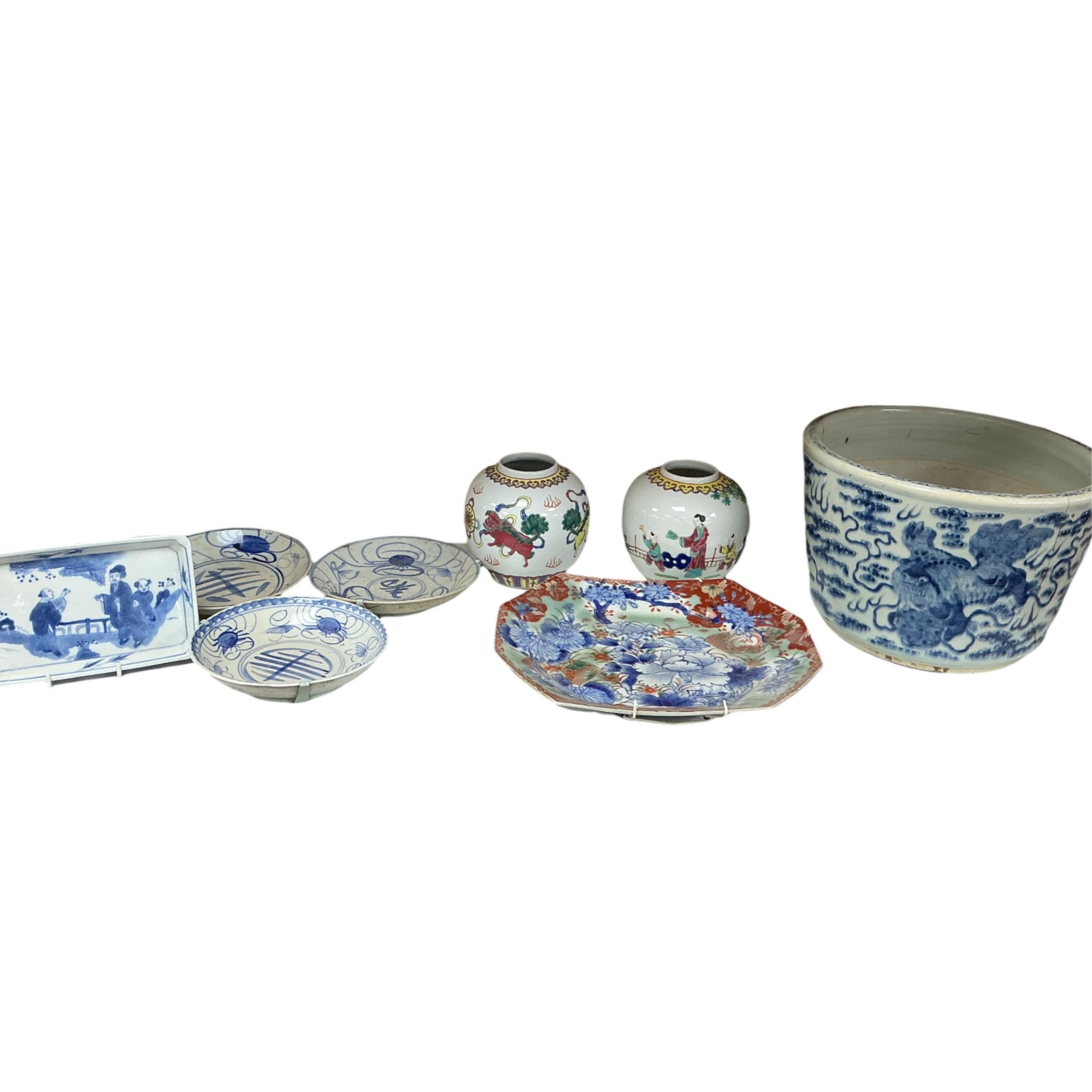 A Chinese porcelain jardiniere, pair of enamelled ginger jars, Japanese serving dish and four other items, jardiniere 27cm diameter.
