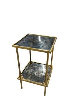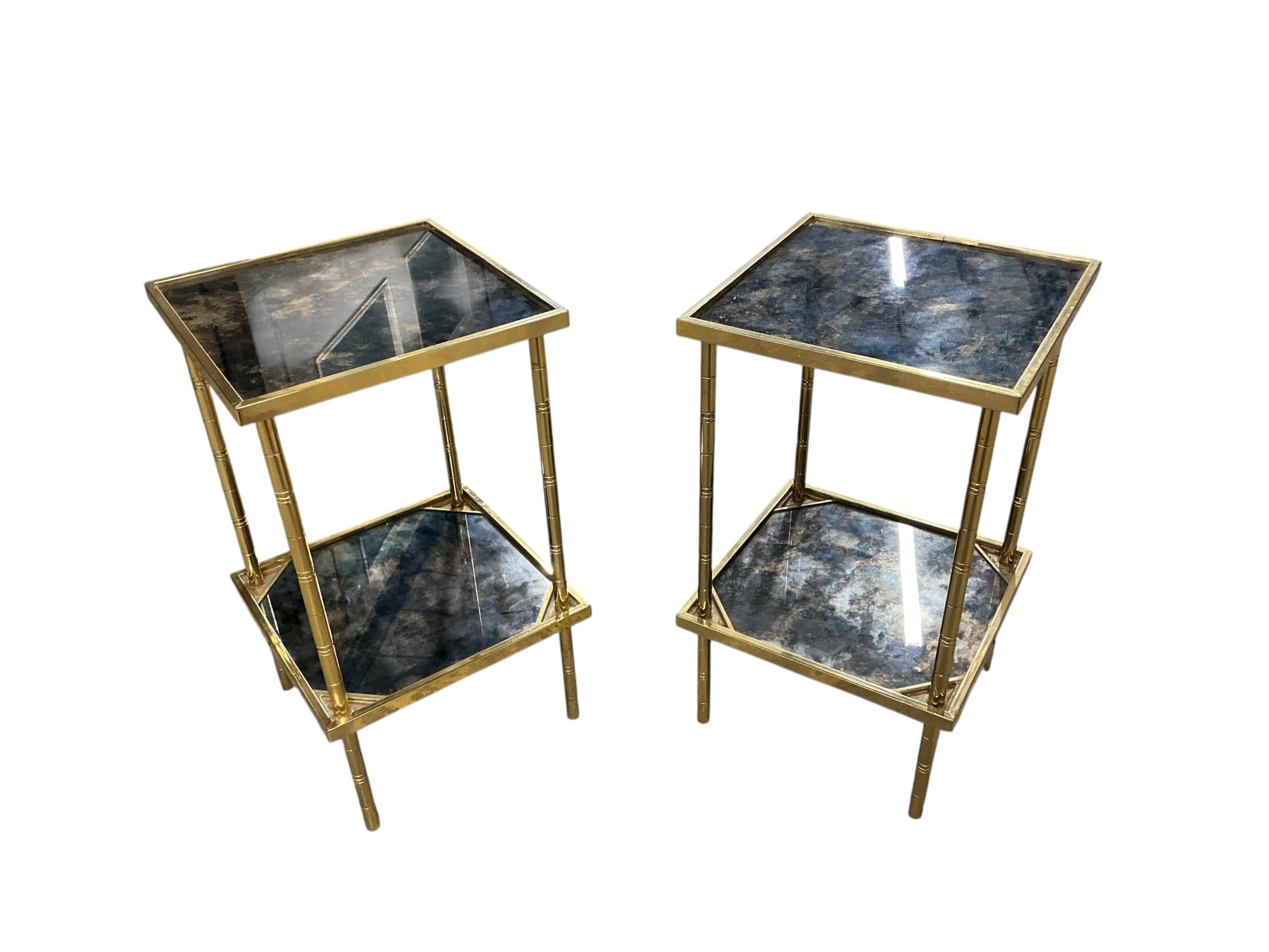 A pair of square brass two tier occasional tables, width 35cm, height 62cm.