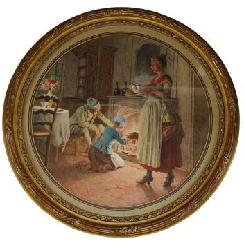 Lot 749 , Maurice Leloir (French, 1853-1940), ‘Le Repas du Soir’, signed, Galerie Georges Petit ink inscribed label verso, with accompanying paperwork from The Canon Gallery, tondo watercolour, 27cm in diameter