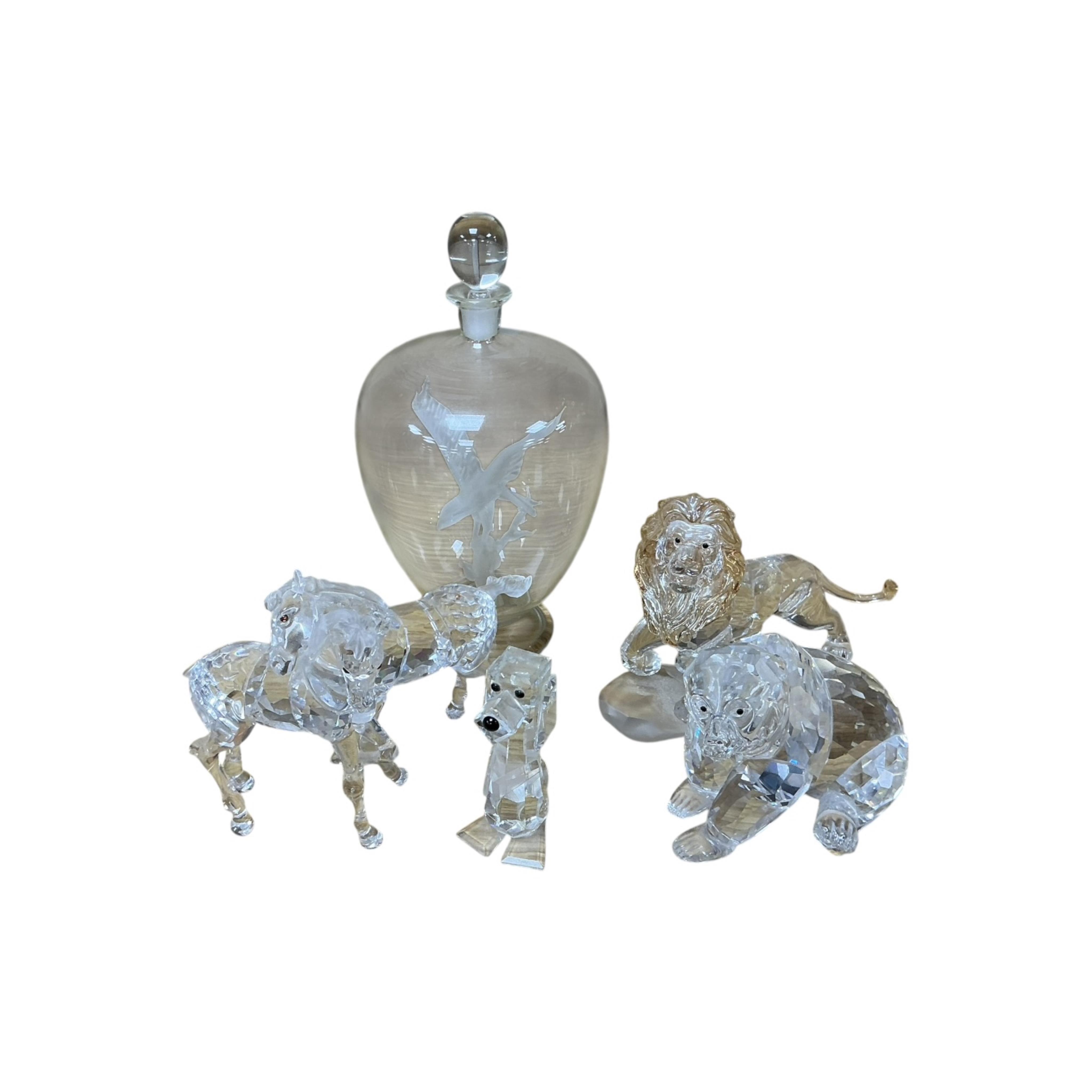 Lot 3556 , Four Swarowski crystal animals and a clear and opaque eagle scent bottle, largest height 16cm.