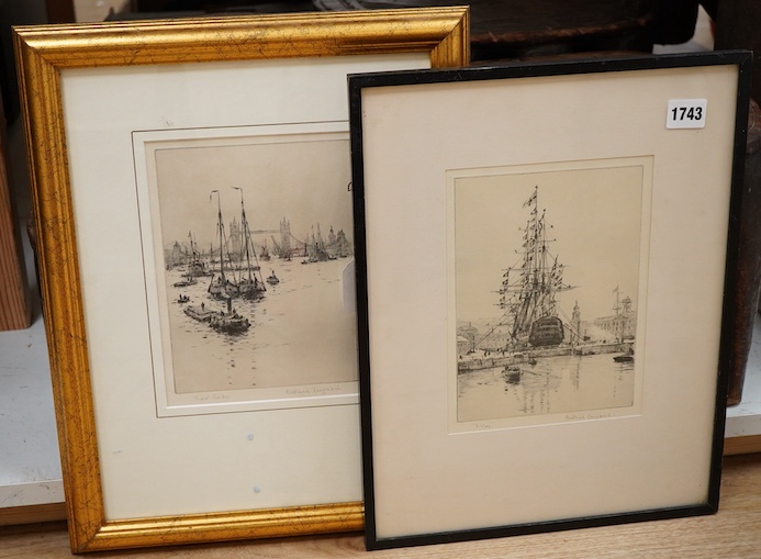 Rowland Langmaid RA (1897-1956), ‘Victory’ and ‘Tower Bridge’, each signed in pencil and inscribed to the margin, two etchings, largest 21 x 16cm