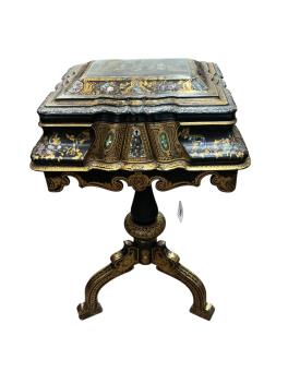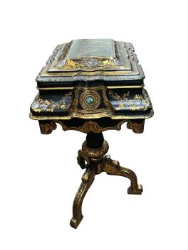 Lot 1091 , A Victorian black lacquered papier maché work table with mother-of-pearl inlay, width 48cm, depth 41cm, height 85cm