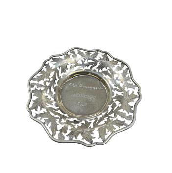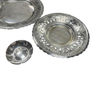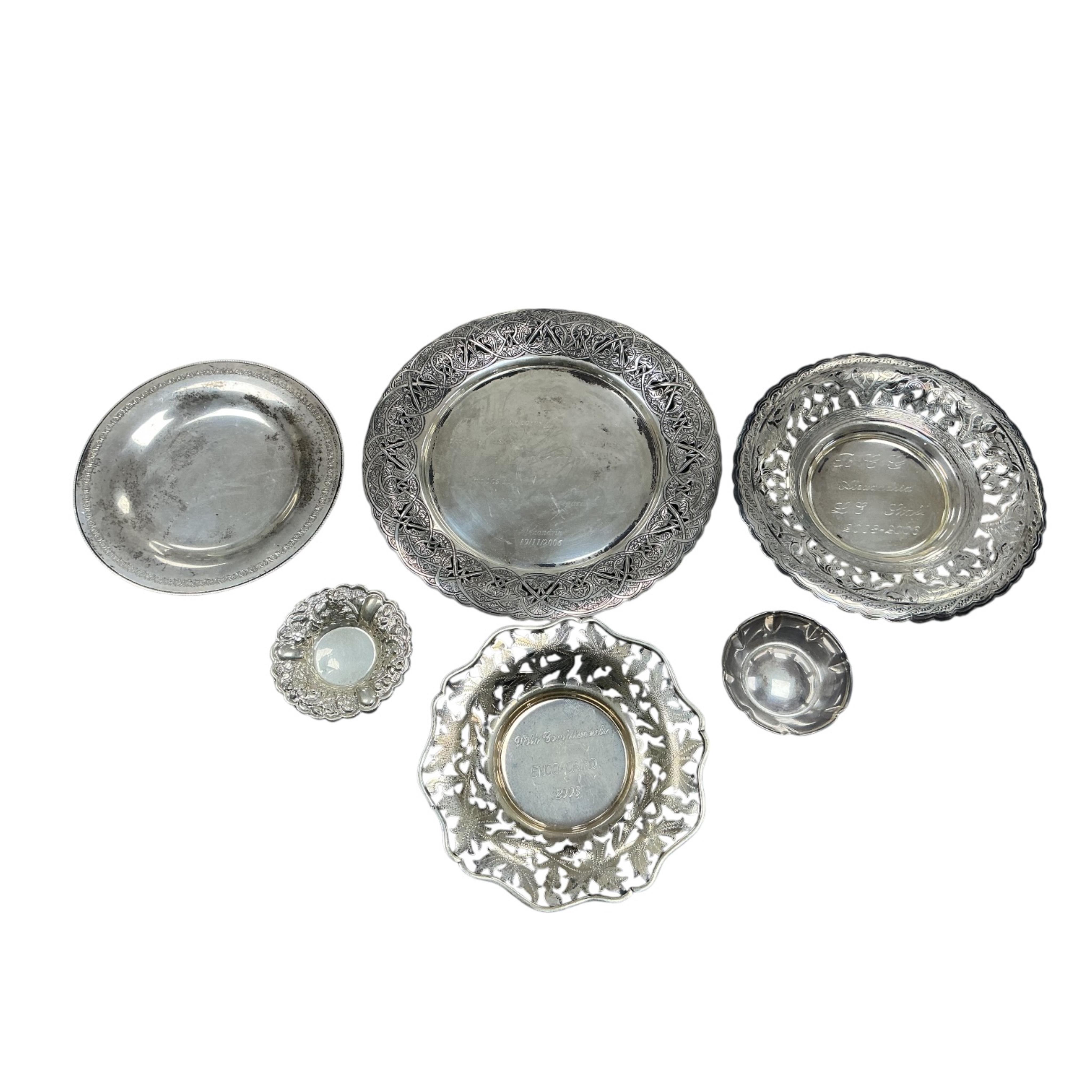 Lot 843 , Two recent Egyptian white metal circular dishes, with pierced borders and engraved inscriptions, largest diameter 24cm, together with three smaller Egyptian white metal dishes and a Middle Eastern white metal dish with e