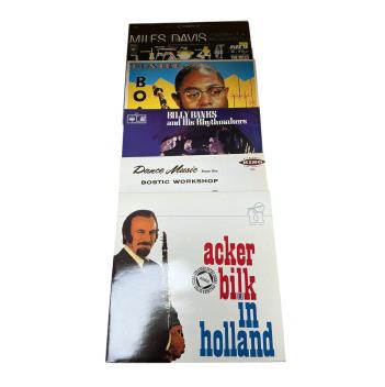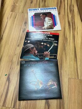 Lot 3005 , Fifty Jazz LP record albums, artists include; Benny Goodman, Dizzy Gillespie, Stephane Grappelli, Stan Getz, Don Ellis, Dexter Gordon Quartet, Ella Fitzgerald, Count Basie, Louis Armstrong, Art Blakey, Miles Davis, Johnn