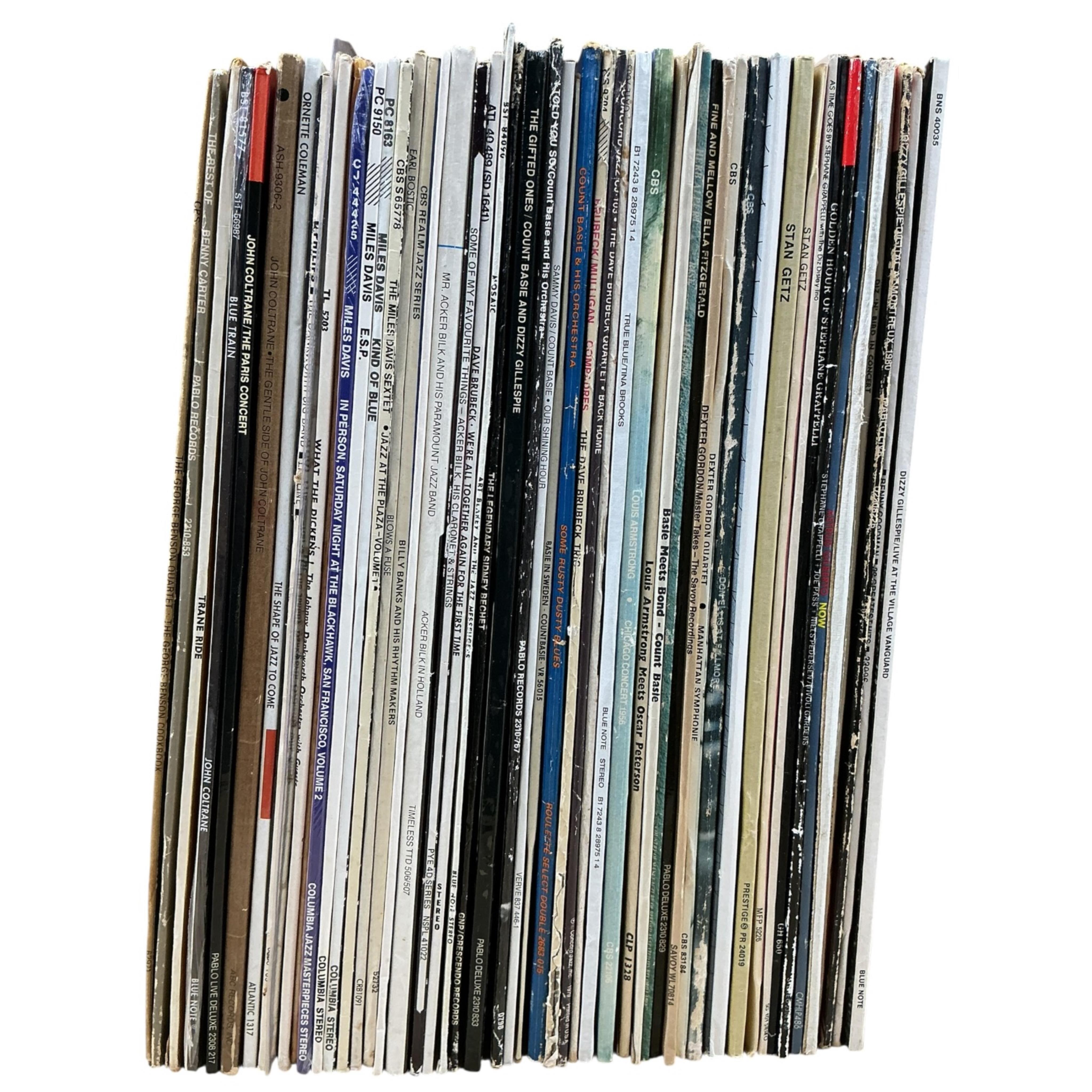 Fifty Jazz LP record albums, artists include; Benny Goodman, Dizzy Gillespie, Stephane Grappelli, Stan Getz, Don Ellis, Dexter Gordon Quartet, Ella Fitzgerald, Count Basie, Louis Armstrong, Art Blakey, Miles Davis, Johnny Dankworth, John Coltrane, etc.