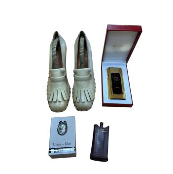 Lot 358 , Christian Dior. A pair of vintage shoes & bottle of Diorama Paris perfume, together with a bottle of Must De Cartier Paris Parfum in original box, plus one more empty bottle, (4).